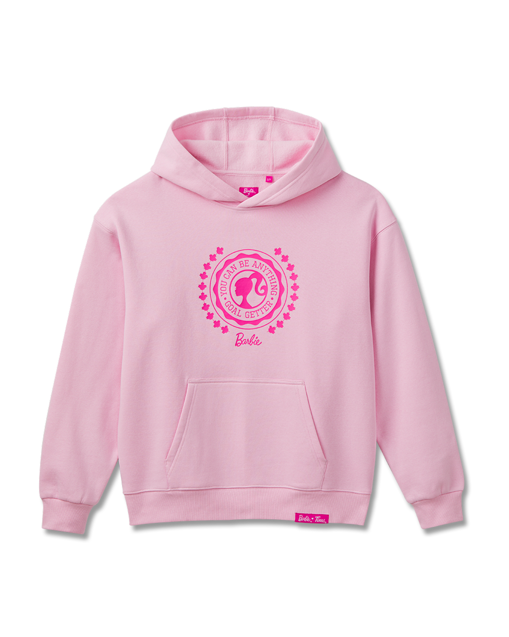 Step into your power and your pink with the limited edition Barbie® Hoodie. The hoodie features a relaxed unisex fit. kangaroo pockets. and ribbed cuffs for comfort. In partnership with Barbie.